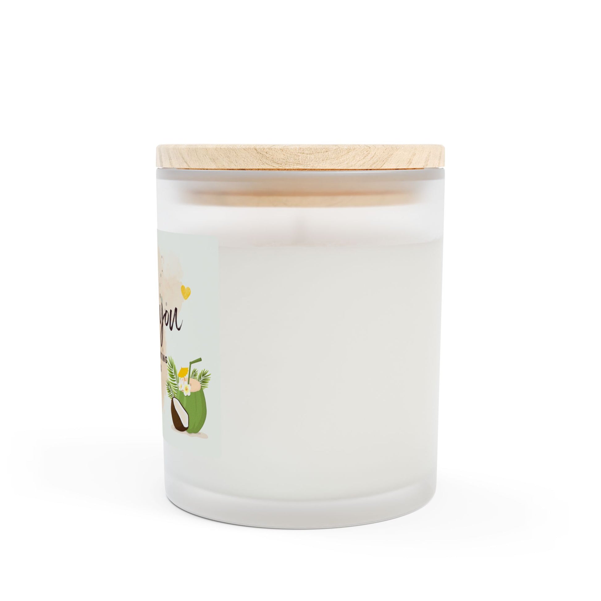 - Frosted glass vessel with a chic raw maple lid